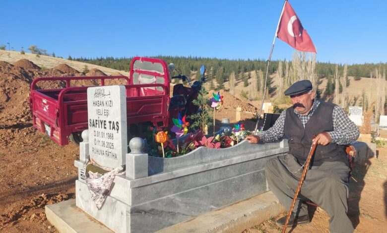 57 yaşında hayata veda eden Safiye Taş’ın ardından büyük bir boşluğa düşen Veli Taş, eşine duyduğu sevgi ve özlemi, mezarı başında geçirdiği saatlerle dindirmeye çalışıyor. Aslen Çorumlu olan, uzun süredir Kırık Köyü çevresinde ikamet eden Veli Taş, Hüseyin Kahya Parkı’nda tespih satarak geçimini sağlıyor.